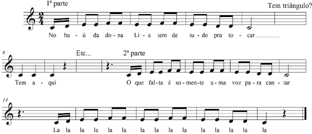 As crianças foram inicialmente apresentadas aos instrumentos que seriam usados e receberam instruções sobre como cada um deles deveria ser tocado. Os participantes não puderam testar o som ou o modo de tocar os instrumentos antes do início da atividade. A todas as crianças foi proposto um jogo de execução musical. O experimentador apresentou a primeira parte da canção da Figura 1 (criada para o experimento) aos participantes, e de- monstrou o ritmo em que os instrumentos deveriam ser tocados assim que seus nomes fos- sem mencionados. Após essas explicações, o jogo teve início com cada criança tocando um dos instrumentos musicais assim que o nome deste instrumento fosse ouvido. Após a exe- cução de todos os instrumentos, a parte final da música era cantada. Esse jogo foi repetido até que todos os participantes pudessem tocar os 10 instrumentos usados na atividade.