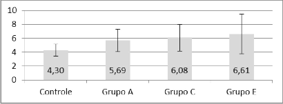 A realização de uma ANOVA sobre as médias do gráfico 1 demonstrou não existi- rem diferenças significativas entre o desempenho dos grupos no teste de percepção. O teste de Tukey realizado sobre esses mesmos dados também não apontou diferenças significati- vas entre as médias. A realização de uma série de testes t de Student apontou para a existên- cia de diferenças significativas entre as médias do grupo controle e do grupo E (F = 8,2443; p = 0,0140), entre as médias do grupo controle e do grupo C (F = 6,4940; p = 0,0270), e en- tre as médias do grupo controle e do grupo A (F = 9,0419; p = 0,0109).