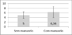 (grupos C e E) e dos grupos que não manusearam (grupo controle e grupo A), acompanhadas de erro padrão.