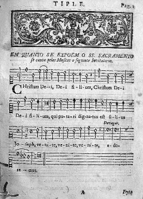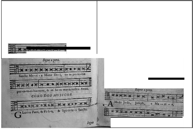 No que diz respeito ao repertório impresso em Portugal no século XVIII, a única obra musical com “unidades funcionais”24 polifónicas destinada a este tipo de devoções são as já mencionadas Preces que se devem cantar nos dias da novena, e festa do glorioso pa- triarcha S. Joseph, publicadas em 1724 e reeditadas em 1758. O conjunto consta de quatro volumes, um para cada voz: Tiple, Alto, Tenor, Baixo.25 A sua disseminação parece ter sido considerável e terá chegado ao Brasil, sendo provável que os “Doze livrinhos da Novena de São Jozé” mencionados numa relação de “Livros Novos” datada de 11 de Janeiro de 1753 do cardeal de Mariana correspondesse a esta publicação (COTTA, 2001, p. 4).