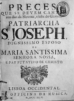 Com efeito, o modelo supremo emanava do poder monárquico e daí decorre a pre- ocupação pela sistematização e uniformização patente, por exemplo, nas Preces que se devem cantar nos dias da novena, e festa do glorioso patriarcha S. Joseph, impressas em Lisboa em 1724 na Officina Joaquiniana de Musica e novamente editadas em 1758, pelo li- vreiro José da Costa Coimbra (ALBUQUERQUE, 2006, p. 34). O Prólogo da edição de 1724 dá a entender que Novena tinha já uma tradição solene estabelecida na Basílica Patriarcal de Lisboa: