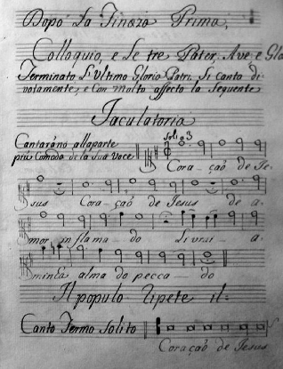 Nas Novenas, Trezenas e Setenários, a língua portuguesa restringia-se às Jaculatórias, invocações breves que adquirem normalmente o perfil de uma fórmula melódica própria fa- cilmente memorizável, tanto nas versões mais simples do repertório como no contextos de composições mais elaboradas. Convém contudo ter em conta que o uso do português não era apenas uma forma de comunicação simplificada ligada às passagens cantadas pela assistên- cia (ou seja, pelo “Povo”). Por um lado, há algumas Jaculatórias atribuídas a músicos profis- sionais no repertório mais tardio; por outro, existem secções em latim (em cantochão) que também são atribuídas ao Povo, tanto nas Novenas e Trezenas como noutro tipo de obras, em particular no Te Deum alternado que se cantava no Dia de São Silvestre.