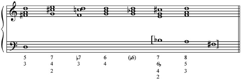 ᆳcas. A escolha do esquema harmônico das cadências poderia, portanto, se constituir num problema delicado, que foi solucionado a partir de dados ᆳte um capítulo, o de número 41, dedicado à livre fantasia. Neste trecho o ᆳmo de improvisação, apresentados sob a forma de baixos cifrados. De um destes exemplos foi retirado, com ligeiras alterações, o modelo harmônico ᆳsição do baixo original de sol para ré e com a realização do baixo cifrado (BACH, 1762, p. 330):
