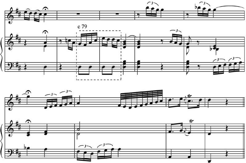 Figura 4: Cadência para o Allegro un poco, que contém fragmentos de dois motivos escolhidos do movimento (c. 1 e 2; c. 79)