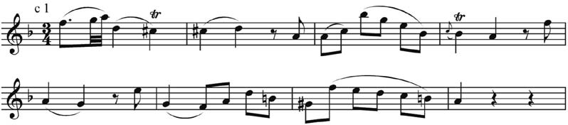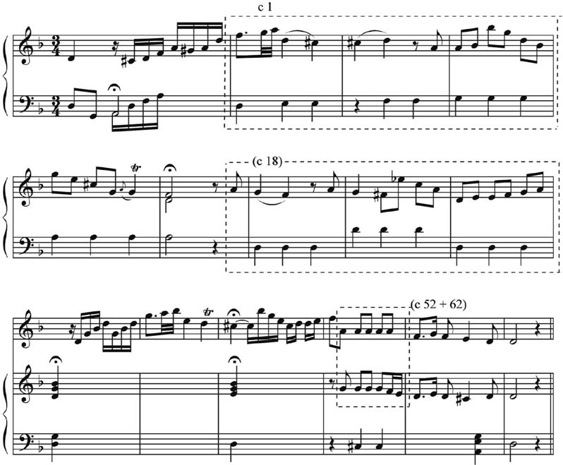 “Cadências precisam originar-se do principal sentimento da peça, e incluem uma curta repetição das mais agradáveis frases contidas nela.” (Quantz, 1752, p. 154). Esta recomendação, ainda do mesmo autor, ajuda ᆳᆳᆳmentos de dois motivos com fortes características. O primeiro, também o primeiro a aparecer na sonata, começa na parte do cravo: