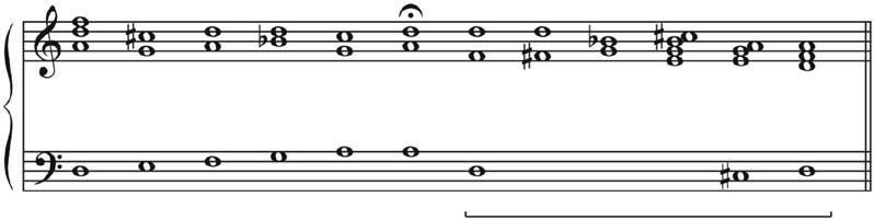 Figura 8: Modelo harmônico para a segunda cadência; os seis primeiros acordes derivam da harmonia do primeiro motivo escolhido. Após a fermata, o modelo é também do compositor: C.Ph.E. Bach, Versuch über die wahre Art das Clavier zu spielen, 2a parte (1762), ex. (e), p. 330