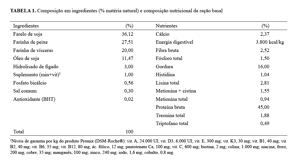 larva/litro. As rações foram formuladas de forma a se apresentarem