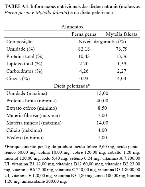 1817) alimentados com ração comercial para camarão marinho e os moluscos Mytella