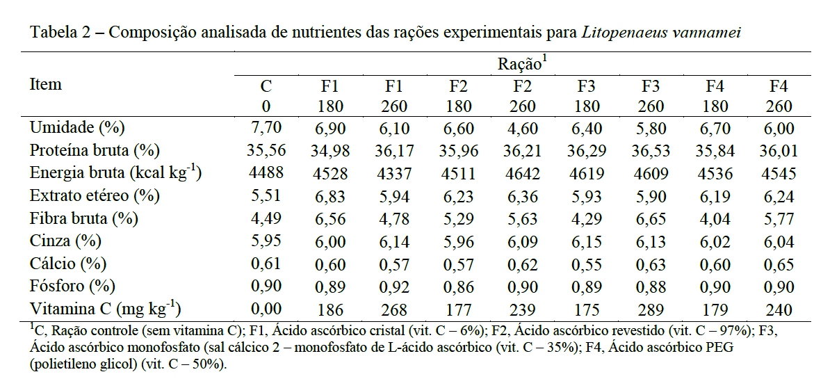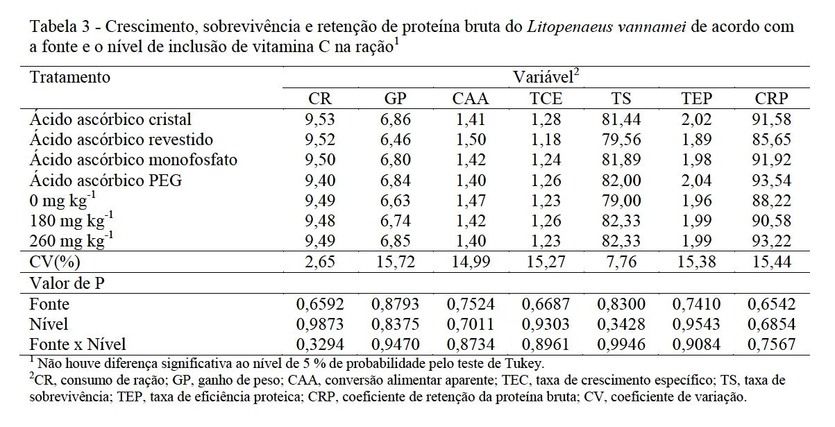 de vitamina C nas fontes e níveis avaliados para o camarão Litopenaeus vannamei com peso acima de 5 g não revela melhorias no