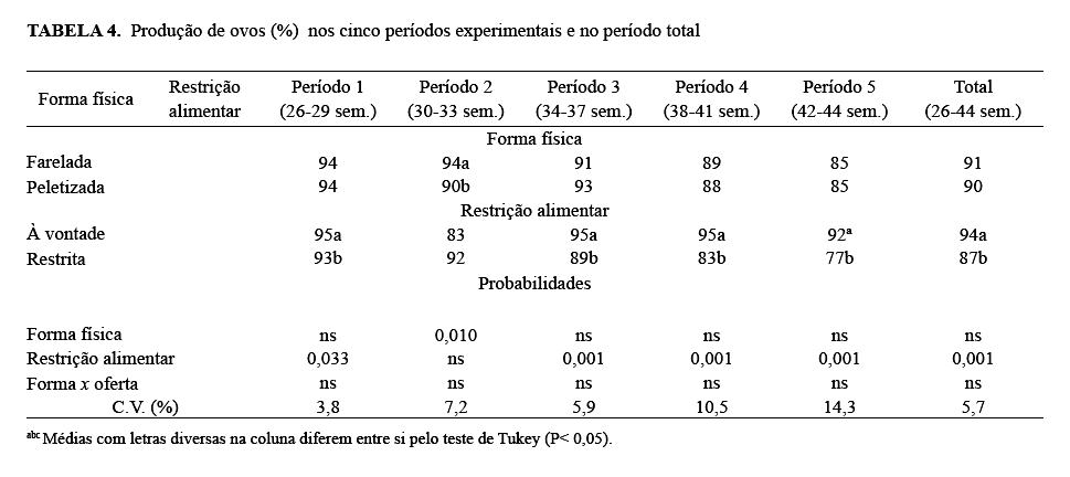 restrição alimentar (à vontade vs.10% de restrição) em 160 poedeiras