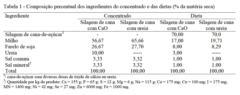 As baias foram providas de comedouros e bebedouros, dispostos frontalmente, com 1,5 m2, e os animais foram alimentados com dieta contendo 70% da silagem de cana-de-açúcar com óxido de cálcio ou ureia e 30% de concentrado (Tabela 1). A composição das dietas encontra-se na Tabela 2.