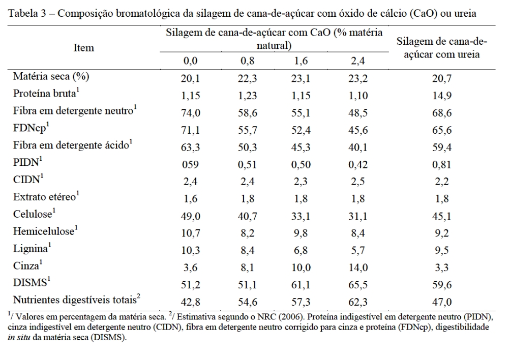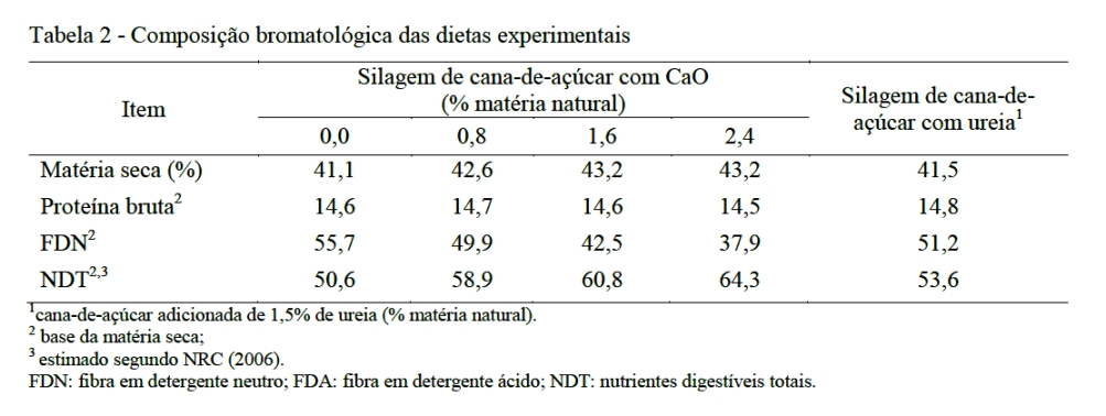 A silagem de cana-de-açúcar, nos tratamentos com CaO, no momento do fornecimento aos animais, foi corrigida para 1% de ureia (mistura de ureia + sulfato de amônio) na relação 9:1. As dietas foram calculadas com base no NRC (2006), para permitir que houvesse nutrientes (NDT e PB) suficientes para um ganho de peso de 150 g/dia. Elas foram balanceadas para conterem aproximadamente 13% de proteína bruta.
