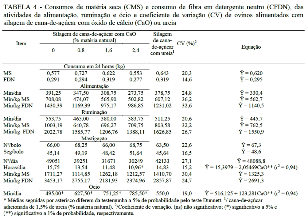 O consumo de matéria seca (MS) e fibra em detergente neutro (FDN) (kg) não foi afetado (P>0,05) pela utilização da silagem de cana-de-açúcar com óxido de cálcio (CaO) em relação à silagem com ureia no período de 24 horas (Tabela 4).
