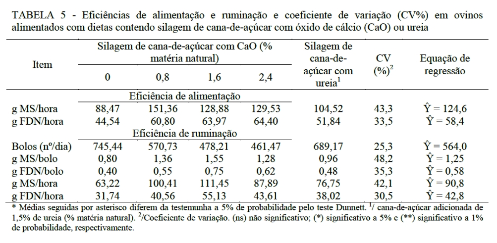 Não houve diferença (P>0,05) quanto à eficiência de alimentação e ruminação (Tabela 5) na silagem de cana-de-açúcar com óxido de cálcio em relação à silagem com ureia, como também entre as doses de óxido de cálcio, possivelmente, pela ausência de efeito significativo no consumo de matéria seca observada nas atividades. A ausência do efeito observada nas atividades de alimentação e ruminação pode estar também relacionada com a aproximação entre a composição química das dietas (Tabela 2), em que os tamanhos das partículas dos alimentos apresentaram semelhanças, visto que seu processamento foi o mesmo para todas as dietas experimentais. Esses argumentos são confirmados por VAN SOEST (1994), para quem o tamanho da partícula pode ser um fator importante que influencia o valor nutricional do alimento, pois afeta tanto o consumo de matéria seca quanto a retenção ruminal, e por SAENZ (2005), para quem o tamanho de partículas dos alimentos exerce grande efeito sobre as atividades de ruminação e mastigação.