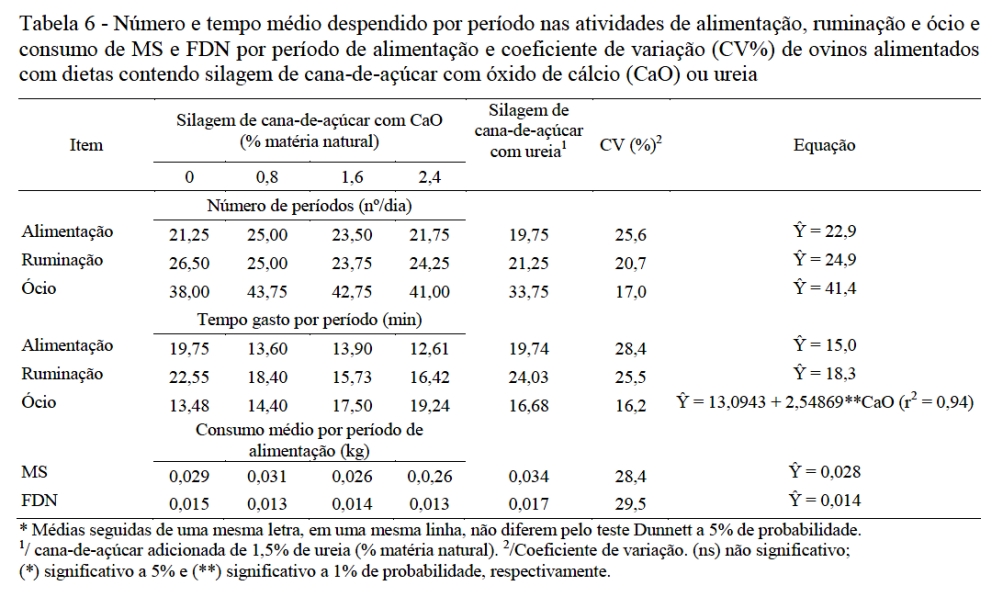 O número de períodos de alimentação, ruminação e ócio foram contabilizados pelo número de sequências de atividade observadas na planilha de anotações. A duração média diária desses períodos de atividades foi calculada dividindo-se a duração total de cada atividade (alimentação, ruminação e ócio em min/dia) pelo seu respectivo número de períodos discretos. Os resultados foram submetidos à análise de variância, procedendo-se posteriormente ao teste Dunnett para avaliar o efeito das doses de óxido de cálcio em relação à ureia (testemunha) e à análise de regressão para o estudo do efeito das doses de CaO, a 5% de probabilidade. Foi utilizado o programa SAEG - Sistema de Análises Estatísticas e Genéticas da UFV (RIBEIRO JR., 2001).
