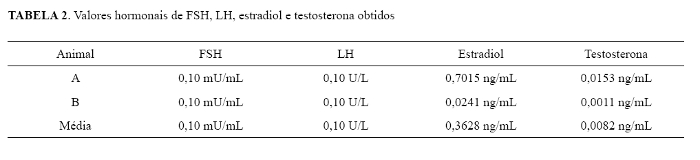 As concentrações de FSH e LH foram semelhantes entre os animais, sendo