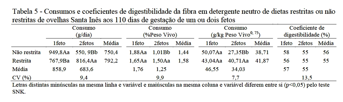 exceto nas frações fibrosas. A restrição alimentar acarretou menor ingestão de