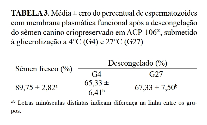 Comparason between glycerol and ethilene glycol for dog sêmen cryopreservation.