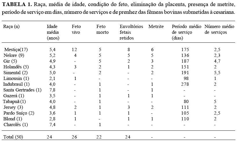 Os resultados encontrados, com relação à condição do feto, eliminação de envoltórios fetais, presença de metrite, período de serviço e número de serviços por concepção, estão resumidos na Tabela 1.