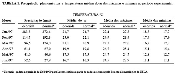 O experimento foi conduzido a campo, de fevereiro a junho de 1997, em área do Departamento de Zootecnia da Universidade Federal de Lavras (UFLA), situada a 21°14’30” de latitude sul e 45°00’10” de longitude oeste, altitude média local de 918m. O clima da região enquadra-se no tipo Cwb da classificação de Köppen, tendo duas estações bem definidas: uma seca, de abril a setembro, e outra chuvosa, de outubro a março. A precipitação média anual é de 1.493mm, com temperatura média anual de 19,36ºC e máxima e mínima de 26,0 e 14,66°C, respectivamente (Vilela& Ramalho, 1979). A precipitação média mensal no período experimental e os valores médios mensais de temperaturas médias máximas e mínimas encontram-se naTabela 1. O experimento foi instalado no delineamento de blocos ao acaso, com quatro repetições e 12 tratamentos arranjados em parcelas subdivididas, empregando-se três cultivares de milheto (milheto comum, BN 2 e CMS 02), semeadas em quatro épocas distintas, correspondentes a 22/2, 14/3, 3/4 e 23/4/1997, alocando-se as épocas nas parcelas principais e as cultivares, nas subparcelas. O solo da área experimental é classificado como latossolo roxo argiloso, cujos resultados analíticos são apresentados na Tabela 2.