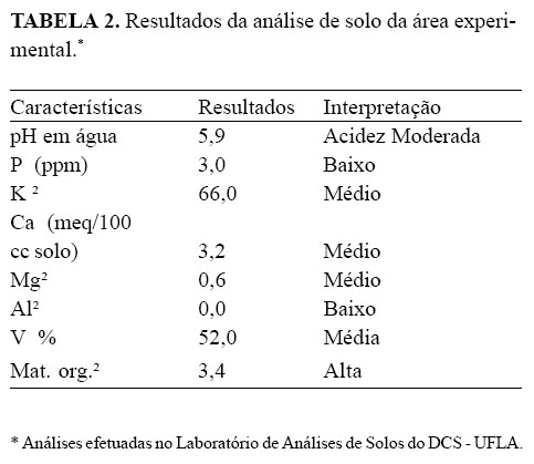 Em outubro de 1996, antes da semeadura do feijão, o solo recebeu uma calagem de manutenção, aplicando-se 1,0t/ha de calcário calcítico com PRNT 75%. Foi feita uma mistura de adubos para aplicação no sulco de plantio do feijão, na seguinte proporção: sulfato de amônio – 100 kg/ha; superfosfato simples – 450kg/ha e cloreto de potássio – 75kg/ha, mais 2kg/ha de FTE (Zn–9,0%; B–1,8%; Cu–0,8%; Fe–3,0%; Mn–2,0%; Mo–0,1%).