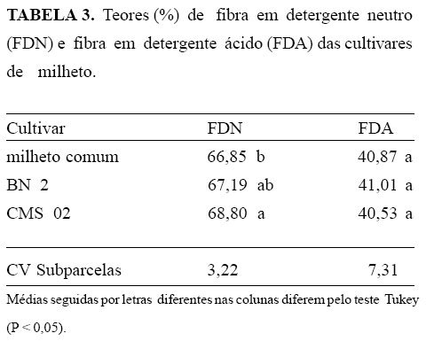 A maior concentração de FDN foi encontrada na cultivar CMS 02 (Tabela 3). Neste sentido, a cultivar milheto comum seria a de melhor valor forrageiro, pois seu teor de FDN foi inferior ao das demais cultivares. Não houve diferenças significativas entre as cultivares de milheto, em relação à FDA; a média das três cultivares foi de 40,8% (Tabela 3).