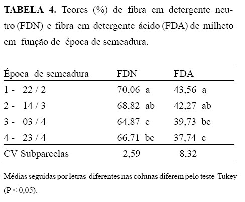 Pelos dados da Tabela 4 observa-se que os maiores teores de FDN (70,06%) foram encontrados nas forragens de milheto semeado na época 1, diferindo significativamente daquele semeado na época 3 e 4 que foram de 64,87% e 66,71, respectivamente. Esse comportamento provavelmente decorre do fato de que com as maiores intensidades de luz e temperatura e com maior fotoperíodo no verão – portanto maior evapotranspiração – há maior produção de MS, porém mais fibrosa. Por outro lado, Thiago et al. (1997) relatam valores de 55,4% de FDN na forragem de milheto, no verão. Houve uma considerável redução no teor de FDA das cultivares de milheto semeadas em 23/4, em relação ao plantio ocorrido em 22/2, seguindo o mesmo comportamento da FDN (Tabela 4).