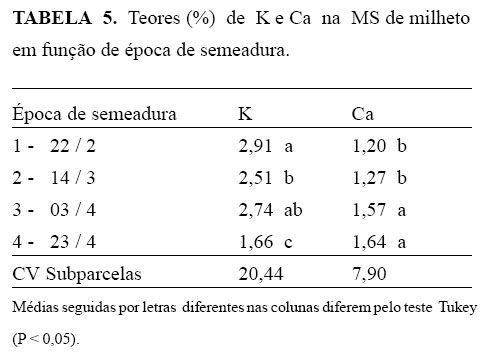 Houve uma interação significativa entre épocas de semeadura e cultivares de milheto, sendoque para todas as cultivares a menor concentração de P na MS foi determinada na época de se meadura 4 (Tabela 6). Este fato provavelmente está relacionado à diminuição de umidade no solo, que afetou a movimentação de P no solo, provo cando a redução nos teores de P na forragem. Ca na MS de milheto foi encontrado por Mattos