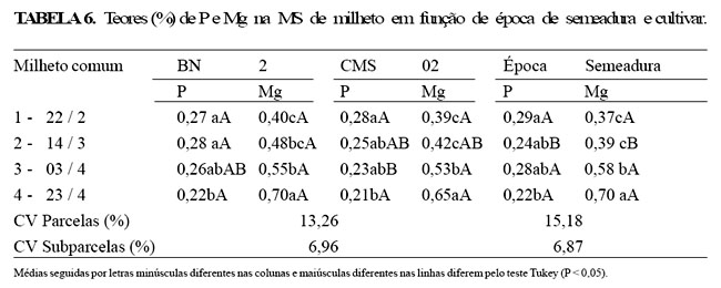 Flutuações no teor de P, semelhantes às determinadas neste trabalho, foram relatadas por Freitas & Dufloth (1988), quando a concentração de P na MS foi de 0,17% no verão e de 0,14% no outono. Também Stobbs (1975) registrou valores de 0,20% de P na MS de milheto. No presente estudo, os teores médios de P foram de 0,24% para a cultivar BN 02 e de 0,25% para as cultivares milheto comum e CMS 02. Nas três cultivares, a concentração de Mg foi crescente à medida que se avançou na época de plantio, alcançando valores expressivos para todas as cultivares semeadas na época 4 (Tabela 6). A concentração média de Mg foi de 0,53, 0,49 e 0,51%, para as cultivares milheto comum, BN 2 e CMS 02, respectivamente.