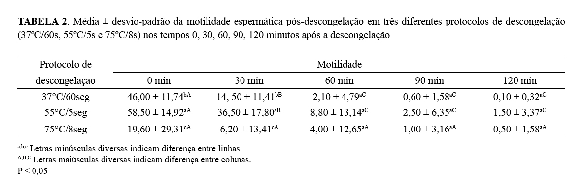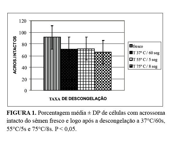 (2006) utilizaram um método de descongelação a 75ºC por 8s para o sêmen