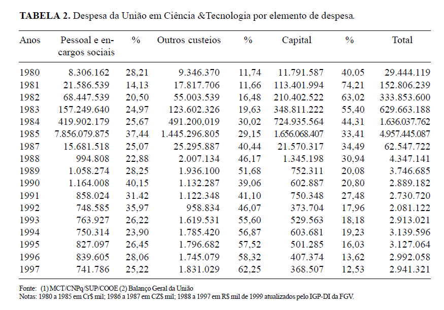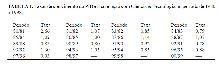Esta variação no nível das despesas realizadas, que, em síntese, significam o montante dos recursos aplicados e não traduzem o nível das demandas e as necessidades de desenvolvimento científico e de geração de tecnologia, pode ser analisada pelas taxas de crescimento da relação PIB–C&T no período 1980–1998, transcritas a seguir.