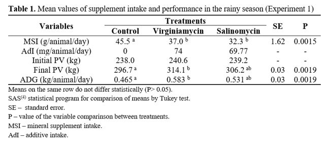 In Experiment 1 (Table 1), the control group showed higher mineral supplement intake (MSI) in g/animal/day, compared to groups supplemented with MS plus virginiamycin and salinomycin (P> 0.05). The group virginiamycin showed a 18.7% reduction in supplement intake, while the salinomycin group had a 29.0% reduction compared to the control treatment. The reduction of MSI for salinomycin group was of 12.7% compared to the virginiamycin group. The control group showed lower amplitude of supplement intake.