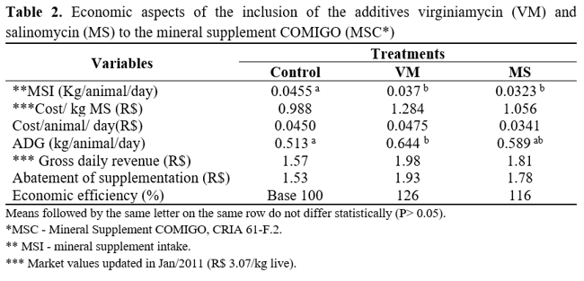 By analyzing the economic aspecs of inclusing additives (Table 2), the salinomycin group showed the greatest reduction in the cost of mineral supplementation, followed by the group treated with virginiamycin. However, the effect of the inclusion of additives in the mineral supplement on weight gain showed that the virginiamycin group, despite having higher daily cost, was the treatment with the greatest financial efficiency: 26% higher than the control treatment and 8.6% higher than the salinomycin treatment that was 16% higher than the control treatment.