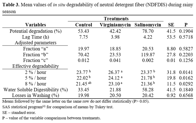 There were differences (P> 0.05) for the effective degradation in the three passage rates analyzed for in situ degradability of NDF (Table 3). Treatment with virginiamycin had the highest degradability in passage rates of 2 and 5%, which was similar to control group and greater than salinomycin in the rate of 8%/hour. Control and salinomycin treatments did not differ in passage rates during the rainy season for NDFDIS. There were no differences (P> 0.05) for the remaining parameters in the rainy season for NDFDIS.