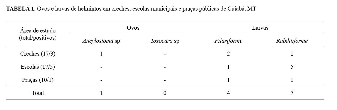 EGGS AND LARVAE OF HELMINTH IN KINDERGARTENS, PUBLIC SCHOOLS AND PUBLIC SQUARES OF CUIABA, MT