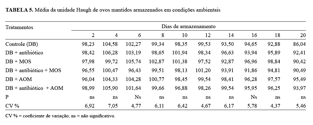 (0,05%), T4 – DB + antibiótico + MOS, T5 – DB + ácidos orgânicos/MOS