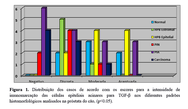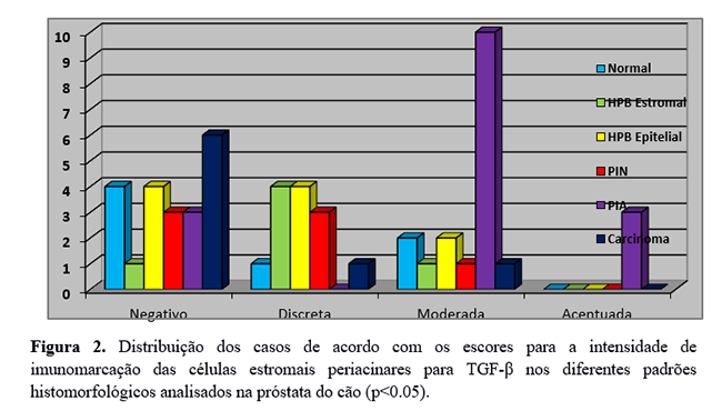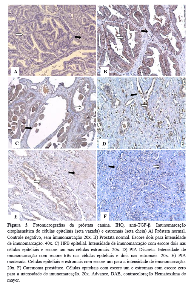 Nas próstatas caninas avaliadas neste estudo foi observada imunomarcação de TGF-β nas células epiteliais e estromais de acordo com o padrão histomorfológico da glândula, havendo positividade nas amostras de próstata normal e com lesões proliferativas benignas (HPB), pré-maligna (PIA e PIN) e malignas (carcinoma). Segundo Niu et al.(11), o TGF-β possui funções de inibição da proliferação tecidual, diferenciação, estímulo à apoptose e indução à angiogênese, apresentando, portanto, papel importante na manutenção da homeostase do tecido prostático normal e na progressão de lesões pré-neoplásicas a neoplásicas, o que parece de fato ocorrer no microambiente prostático quando considerados os resultados da imunomarcação de TGF-β desta pesquisa no tecido normal e em proliferação da glândula canina.