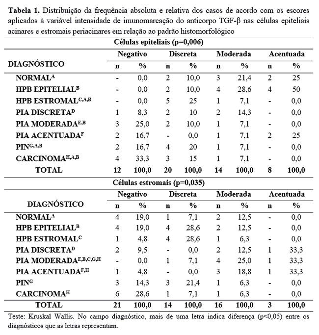 Nas células epiteliais prostáticas o TGF-β apresentou imunomarcação citoplasmática (Figura 3). As amostras de PIA, PIN e carcinoma apresentaram maior frequência de casos com escore zero, e desses a maioria não exibiu imunomarcação em escore acentuado. O tecido prostático normal e com HPB apresentou imunomarcação para TGF-β com os escores variando de um a três para normal e HPB epitelial, e um e dois para HPB estromal. No epitélio acinar foi verificada diferença na imunomarcação de TGF-β entre glândulas com HPB estromal, normal e HPB epitelial, com marcação acentuada nos dois últimos tipos. Também houve diferença entre a imunomarcação de TGF-β nas amostras de PIN e carcinoma em comparação àquelas normais e com HPB epitelial, nas quais houve maior imunomarcação. Ainda, o TGF-β exibiu maior imunomarcação do epitélio acinar nas próstatas com HPB epitelial em relação a PIA moderada (Tabela 1).