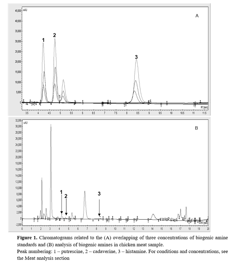 Chromatograms identified biogenic amine (Fig. 1). The absence of minor peaks indicated that these compounds were efficiently separated from other meat components by the extraction method described above. Our results are in agreement with those of Lázaro et al.(7), who found a similar efficiency in peak separation for putrescine and cadaverine when applying the same chromatographic method.