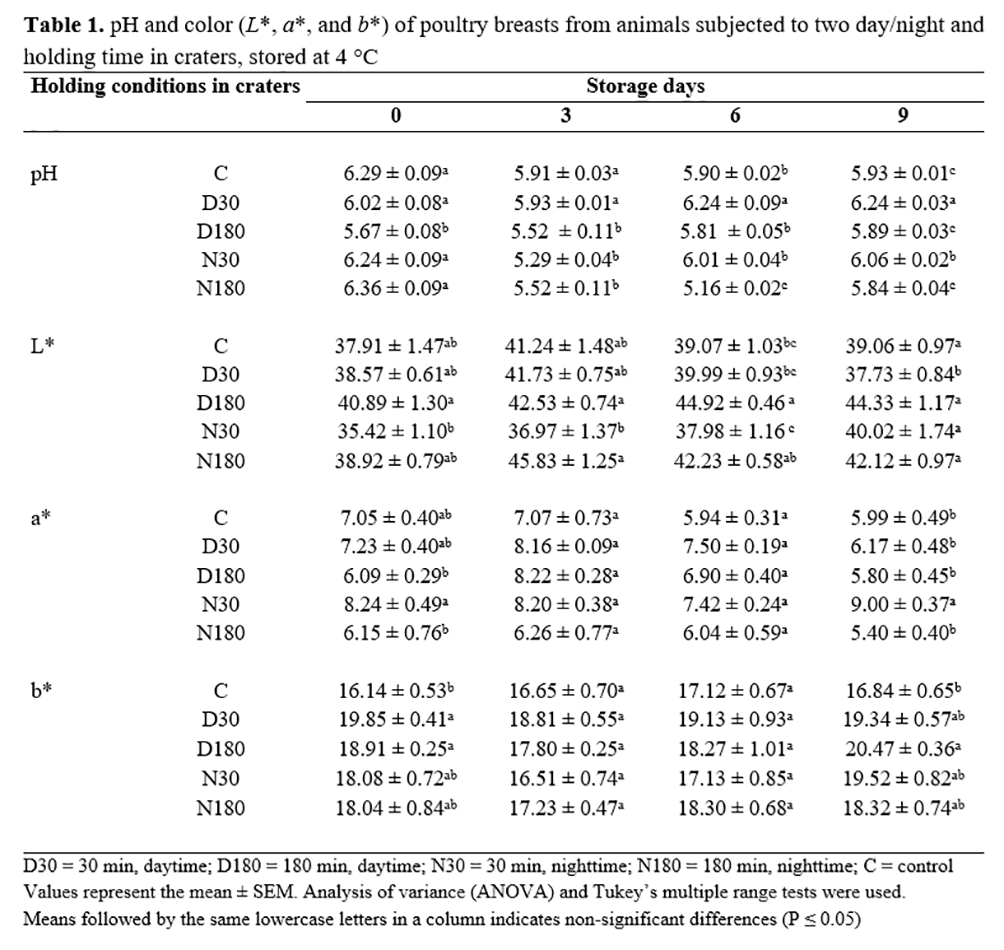 In Table 1, a decrease was observed on day 3 in groups subjected to daytime stress (D30 and D180), with a subsequent significant increase (P<0.001). Nighttime holding (N30 and N180) produced an even steeper decrease, with the lowest pH (5.16) observed for N180.