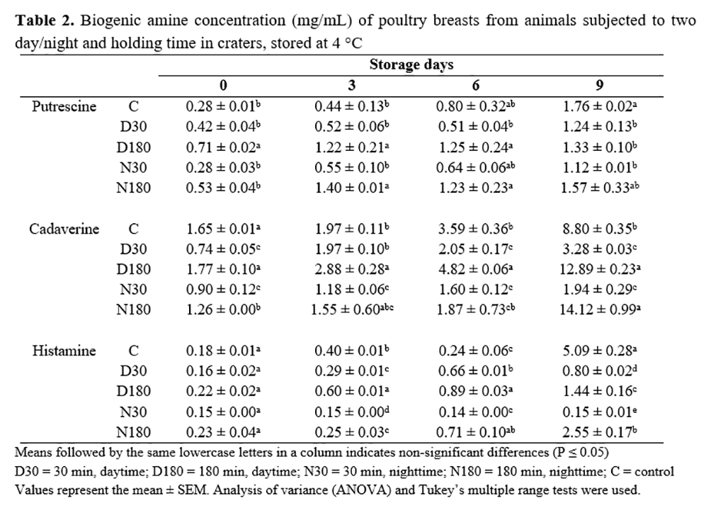 No definite evidence is available regarding the direct effect of in vivo stressors on biogenic amine production in chicken meat. Özogul and Özogul(34) determined that slaughtering rainbow trout by suffocation in ice slurry (stress method) increased the levels of putrescine and cadaverine compared to slaughtering by percussion (conventional method). On the other hand, Cruz-Monterrosas et al.(35) suggested that bruised areas in meat promote its fast decomposition and bacteria growth. This fact favored an increment of biogenic amine concentrations in beef meat. These results emphasized the importance of implementing best management practices during pre-slaughter operations to reduce a possible risk factor. However, according to Jacobs et al.(1), although lairage time is an important stressor, it is not the unique factor that affects meat quality and even the death in the pre-slaughter phase.