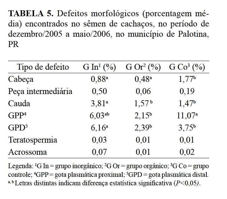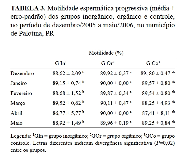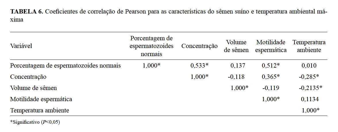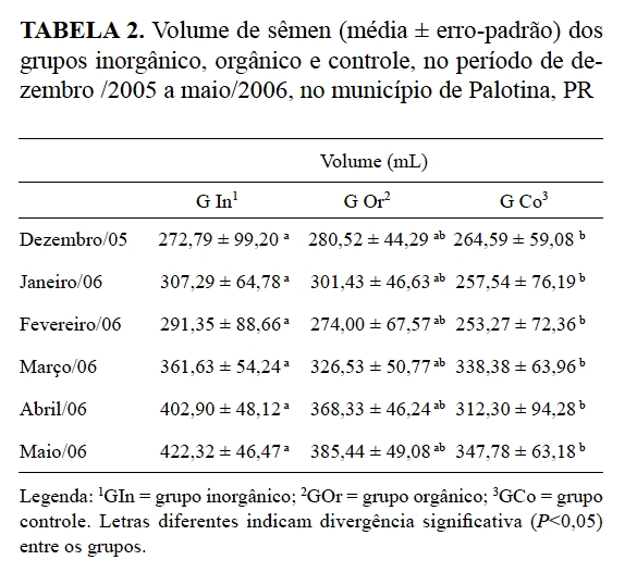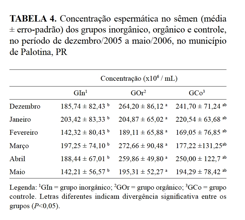 volume e da concentração espermática (Tabela 6), confirmada pela correlação significativa e negativa entre essas variáveis.
