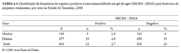 2,4% (4/166) de positivos e as fêmeas 2,8% (19/677). Os resultados