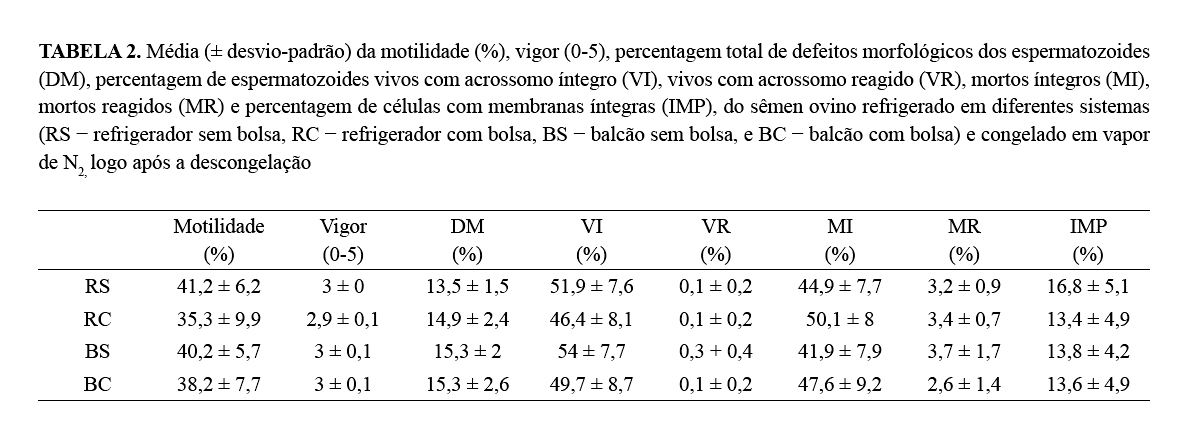 criopreservado. Ao final da refrigeração, os parâmetros espermáticos
