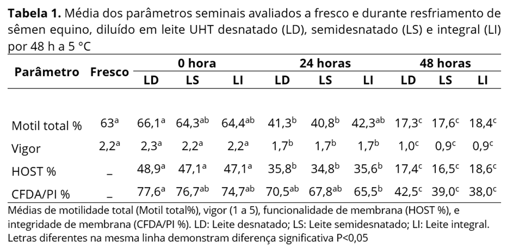 No experimento 1 não foi observada diferença (P>0,05) entre os diluentes (leite UHT desnatado com 0% de gordura, semidesnatado com 1% de gordura e integral com 3% de gordura nas médias de motilidade espermática, vigor, integridade e funcionalidade de membrana plasmática. Entretanto, houve diminuição da qualidade do sêmen após 48 horas de armazenamento (Tabela 1).