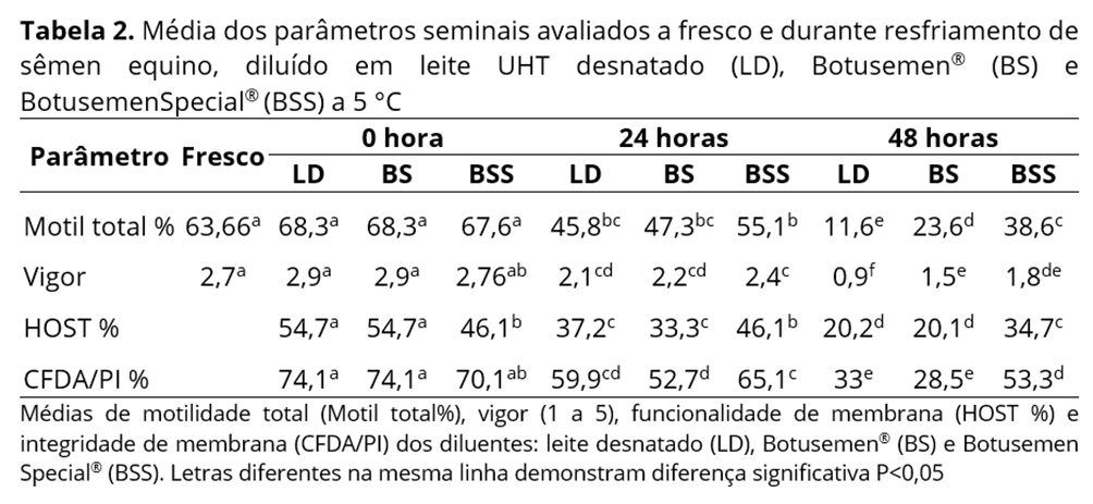 Não houve diferença nas primeiras 24 horas de motilidade total, porém, houve diferença nos seguintes testes: na funcionalidade de membrana (HOST), LD (37,2%), BS (33,3%), BSS (46,1%), e no teste de integridade de membrana (CFDA/PI) (59,9%), BS (52,7%), BSS (65,1%), conforme demonstrado na Tabela 2. Em todos os testes realizados, houve uma maior manutenção da qualidade espermática quando se utilizou o diluente industrializado BSS nas 48 h, diferente do leite desnatado UHT, que foi semelhante aos demais até as 24 horas, e do BS que se apresentou similar ao leite desnatado no mesmo período. Ressalta-se aqui que o diluente industrializado BSS apresentou em 48 horas índices similares de funcionalidade de membrana aos índices apresentados pelos diluentes LD e BS em 24 h de refrigeração (Tabela 2).