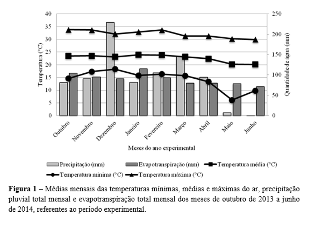 O experimento foi realizado entre outubro de 2013 e junho de 2014 na Fazenda Experimental Capim-Branco, da Universidade Federal de Uberlândia (UFU), localizada em Uberlândia, MG (18º53’19” S, 48°20’57” W e 863 metros de altitude). O pasto de Urochloa brizantha Stapf. cv. Marandu (capim-marandu) foi implantado no ano de 2000. O clima da região é Aw, tropical de savana com estação seca de inverno(8), com estação seca e chuvosa bem definida, sendo a temperatura e precipitação média anual de 22,3 ºC e 1.584 mm. Os dados climáticos durante o período experimental foram obtidos em estação meteorológica localizada a 200 m do local do experimento (Figura 1).