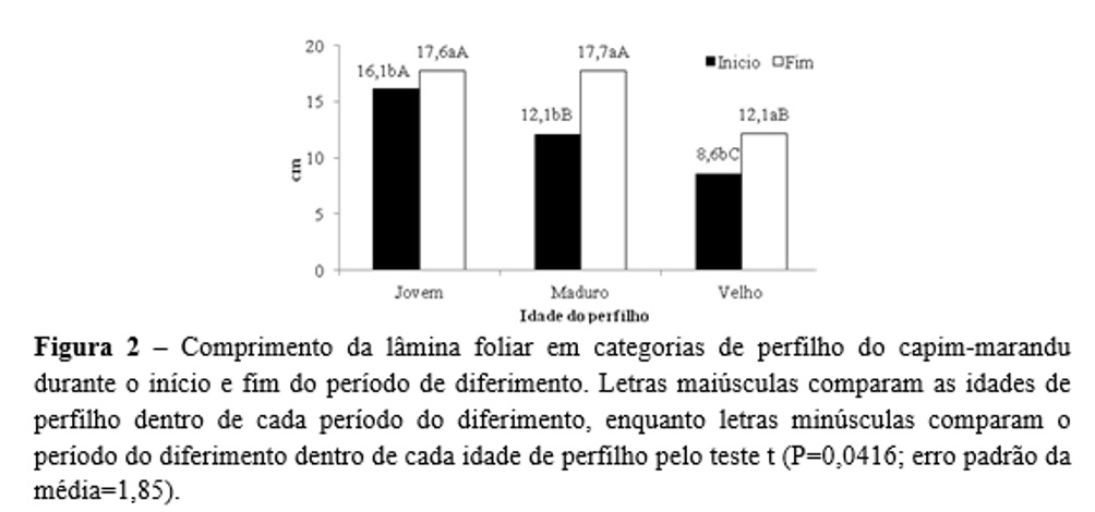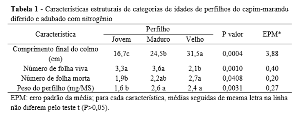 Embora maior no fim do diferimento (Tabela 2), a ocorrência de perfilho velho (em média de 48,7%) foi alta no capim-marandu diferido. Esse resultado é típico de épocas do ano cujo clima é restritivo ao crescimento vegetal, tal como o outono, época em que ocorreu o período de diferimento. Nesta situação, a planta usa a estratégia de conservação de recursos, por meio do aumento na duração de vida das folhas e dos perfilhos(14) que, assim, ficam mais velhos.