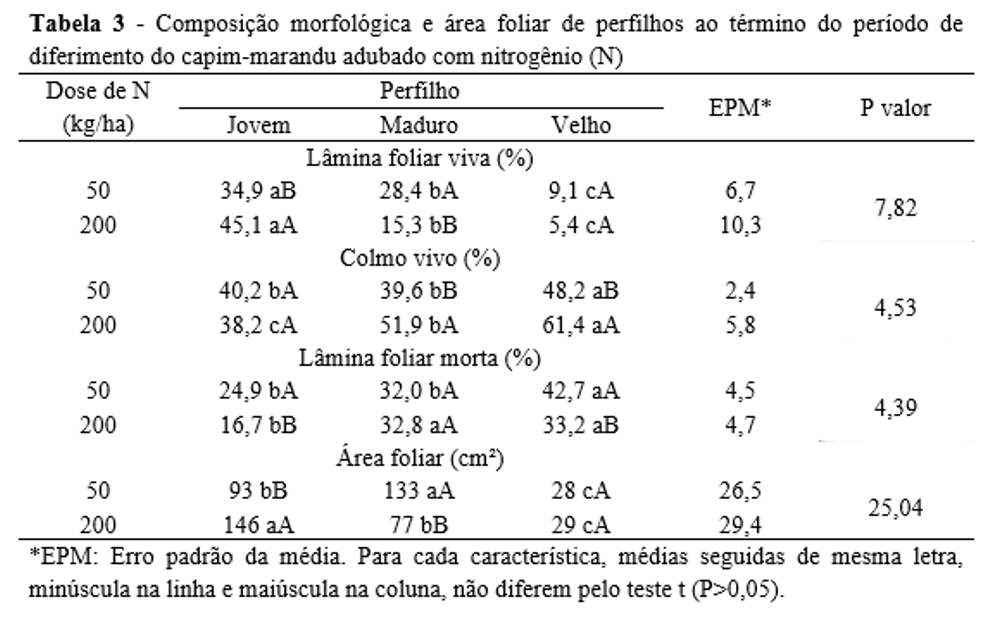 O maior estádio de desenvolvimento do perfilho velho justifica seu maior percentual de lâmina foliar morta ao término do diferimento no dossel sob baixa dose de N. Adicionalmente, é possível que a alta disponibilidade de N tenha aumentado a taxa de desenvolvimento do perfilho maduro que, assim, apresentou diferenciação morfológica semelhante à observada no perfilho velho, razão pela qual, no dossel adubado com alta dose de N, além do perfilho velho, o maduro também apresentou alto percentual de lâmina foliar morta em relação ao perfilho jovem.