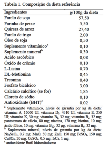 Os alimentos avaliados no presente estudo foram o milho, farelo de trigo, quirera de arroz, farelo de arroz e sorgo. Todos os ingredientes foram moídos de forma a se apresentarem com diâmetro inferior a 500μm. Em seguida, foram incorporados a uma dieta referência prática (Tabela 1) na relação de 6:4 (60,0% da dieta referência e 40,0% do alimento-teste).